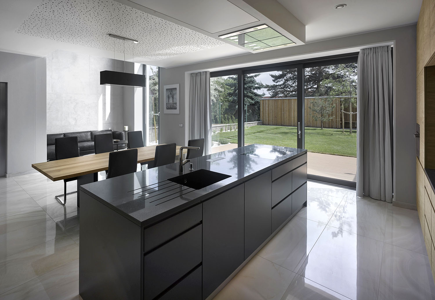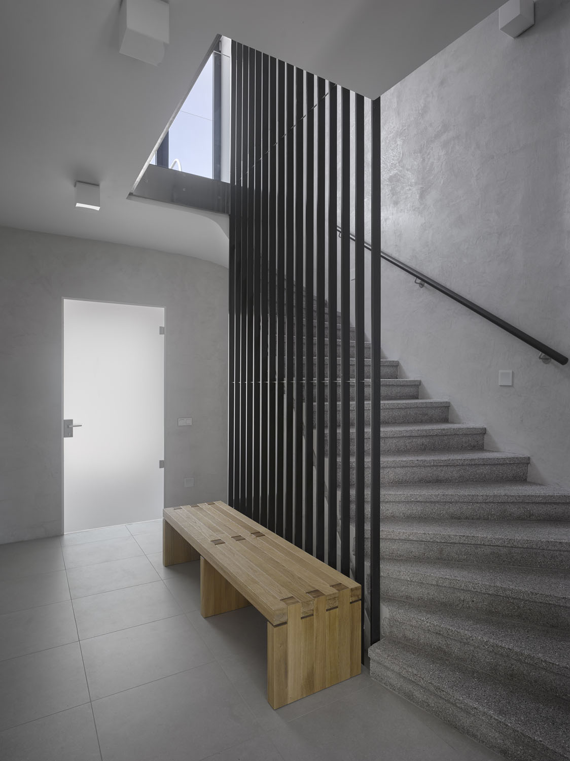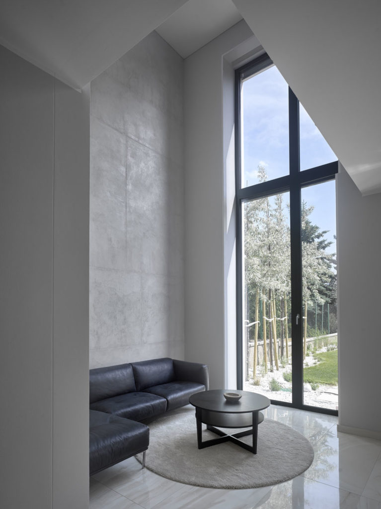 „Interiér jsme sjednotili bílou omítkou, betonovou stěrkou a dubovým dřevem s černými akcenty. Odlišnou atmosféru jednotlivých míst podtrhují nábytkové solitéry navržené na míru,“ dodává. Jediné uzavřené místnosti v domě jsou ložnice se zázemím, orientované do zahrady. Všechna podlaží propojuje výtah.