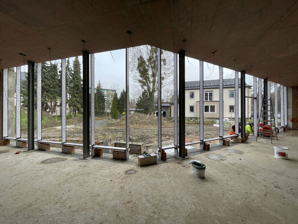 „Zasklení má nejlepší izolační schopnost, jaká byla v době tendru k dispozici. Rozměrným prosklením jsme chtěli skloubit vizuální propojení interiéru s okolím a zároveň dosáhnout téměř nulovou spotřebu budovy, což byly dvě zásadní a docela protichůdné polohy návrhu,“ upřesňuje Karel Kubza a dodává: „V některých místech také musí být osazené protipožární rolety, protože s protipožárním fasádním zasklením bychom nesplnili parametry energetického návrhu. Nebylo jednoduché všechno vybalancovat, ale už teď je na stavbě vidět, že velkoplošné zasklení dá interiéru velkou kvalitu. Nemůžu se dočkat, až bude zahrada zarostlá – sedneme si pak do knihovní kavárny, zapomeneme na problémy se stavbou a budeme se kochat výhledem.“