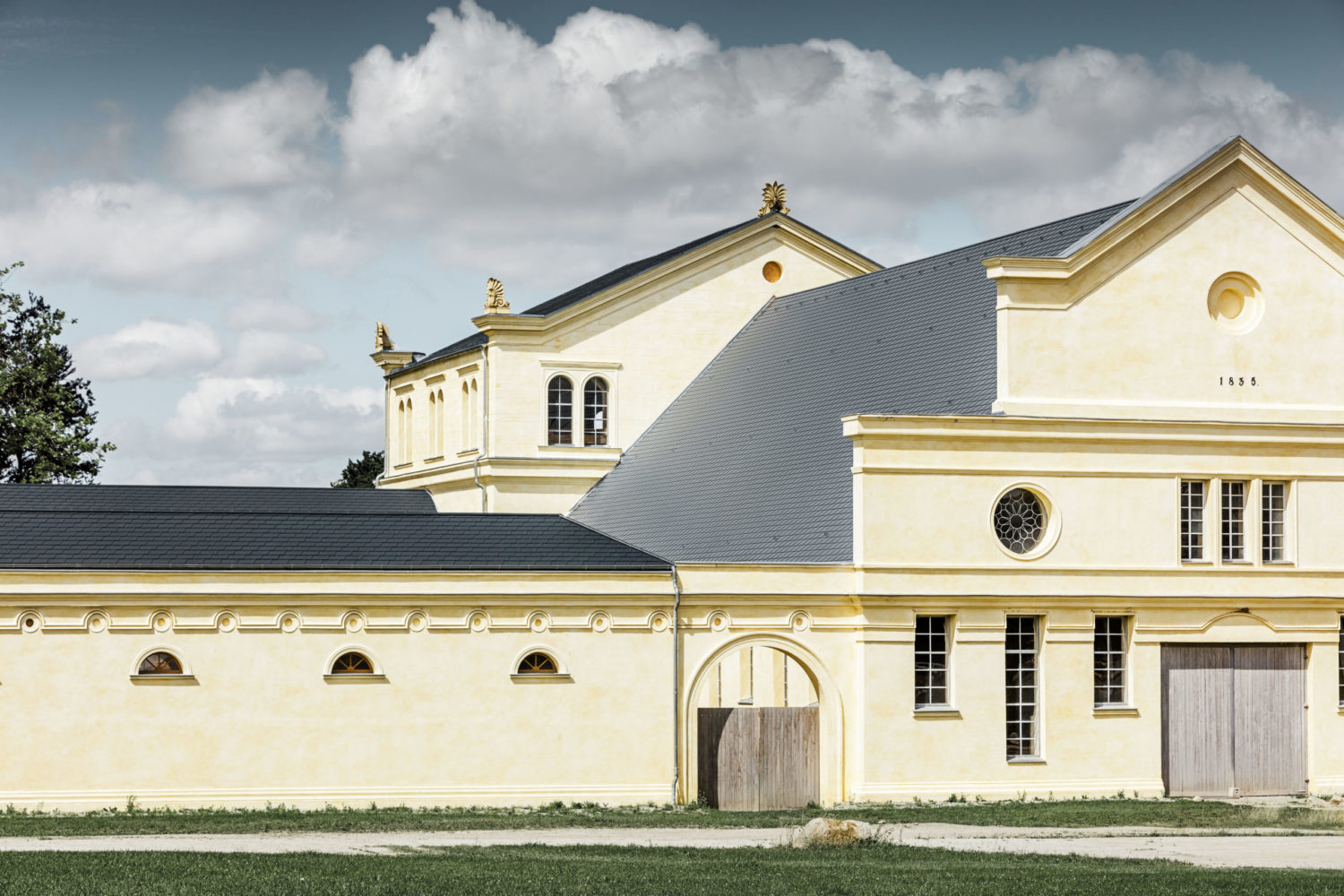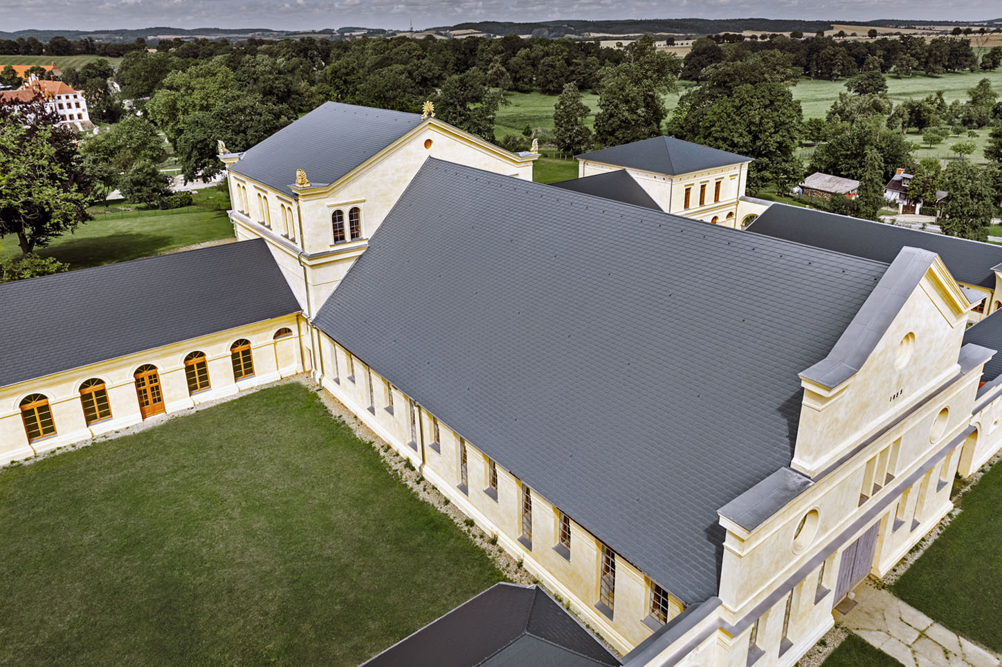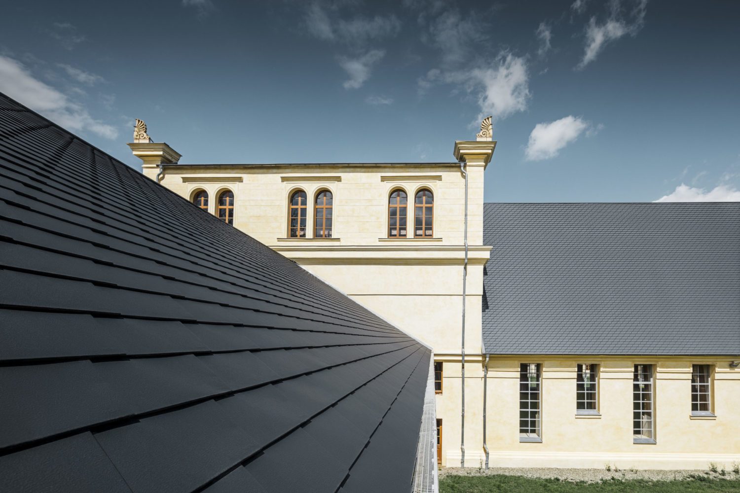 Pro střechu mimořádných rozměrů byly použity PREFA střešní šindele. V jejich prospěch hovořilo mnoho argumentů, vedle vzhledu a dlouhé životnosti především nízká váha hliníkového materiálu, který tak minimálně zatěžuje starou stavební substanci.