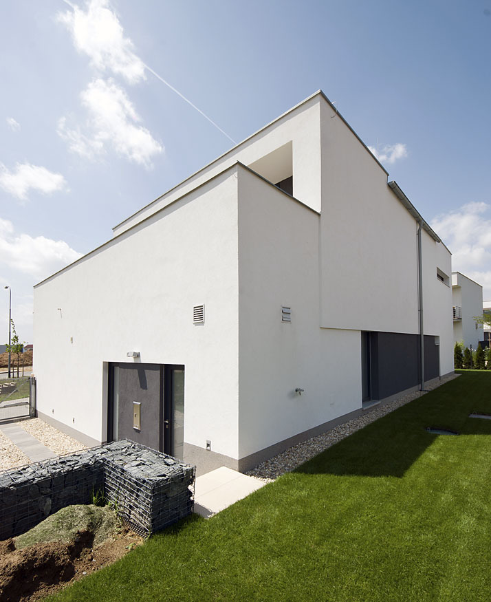 Skladba několika objemů s různou výškou a osazením v terénu umožnila umístit vjezd a vstup na pozemek na snížené úrovni, kde je část vstupních a technických prostor s garáží. Předstoupením vůči hlavní hmotě zároveň vymezuje – společně s výškovým uspořádáním – privátní prostor zahrady vůči polootevřenému vstupnímu prostoru. Hlavní hmotu domu tvoří dvoupodlažní korpus s předstupujícími lodžiemi na osluněných fasádách a terasou na střeše garáže.