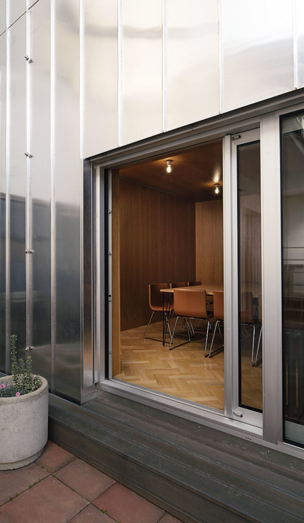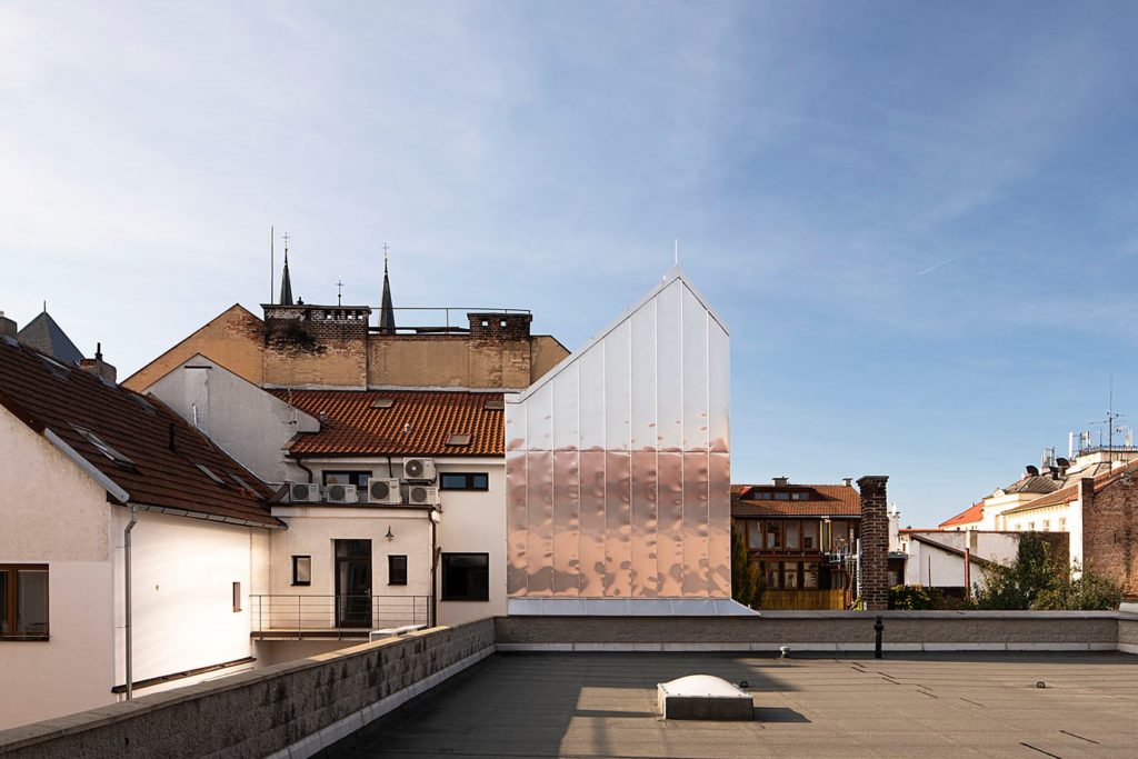 „Dvorek vymezují zdi sousedních objektů, vše je tu natěsno. Proto jsme dali přístavbě tvar věže s minimálním půdorysem a natlačili ji na samou hranici, do severní části pozemku. Dvůr tak zůstal vzdušný, stavba v této pozici nestíní okolní domy,“ uvádí architekt Martin Prokš. Jeho kolega Marek Přikryl ho doplňuje: „Tvar stavby jsme odvodili z prostředí zadních dvorků, svou siluetou zároveň přispívá k dotvoření charakteru místa. Interiér ze dřeva vytváří určitý kontrast k plechové fasádě. Z důvodu omezeného přístupu na staveniště, proveditelnosti a rychlosti výstavby jsme zvolili lehký dřevěný skelet s trámovými stropy.“