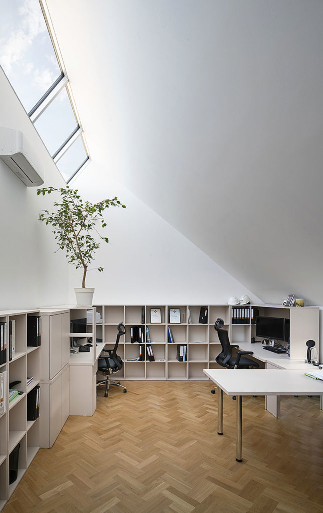 Přístavba kanceláří byla navržena jako dvoupodlažní objekt s podkrovím a asymetrickou sedlovou střechou. V každém patře má jen jednu místnost, její půdorys je totiž 6,25 x 4,9 metru. Provozně je propojena s přilehlým domem, umístěna byla podél hranic pozemku, kde navazuje další zástavba s přízemními objekty.