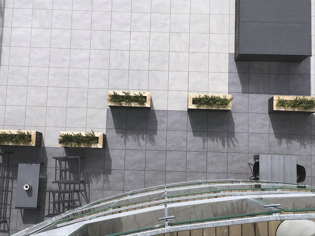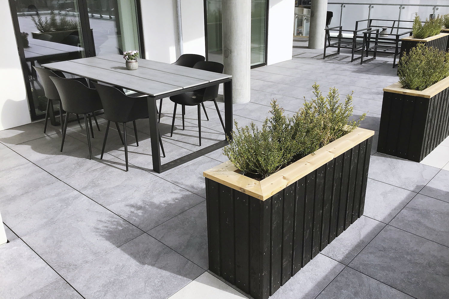 Průmyslový charakter objektu harmonicky doplnily na velkorysých terasách dlaždice RAKO. Ty v plánech nahradily původně uvažované osazení dřevěnými deskami. Mrazuvzdorné dlaždice formátu 60 x 60 x 2 cm ze série Kaamos Outdoor zde tvoří elegantní, robustní základ přibližně 450 m2 venkovního prostoru.