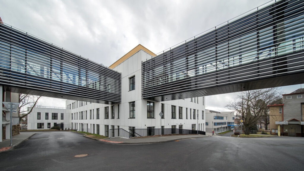 Před dvěma roky se areál pelhřimovské nemocnice proměnil ve staveniště – kromě novostavby pavilonu se opravovala administrativní budova z roku 1932, modernizací prošly také energocentrum a kotelna, společně s pavilonem se budovaly nadzemní mosty. Autoři projektu z projekční a stavebně-poradenské kanceláře Obermeyer Helika se navíc rozhodli, že standard budovy posunou od nízkoenergetického k pasivnímu. Z hlediska provozu to přineslo minimální energetickou náročnost a příjemné vnitřní prostředí.