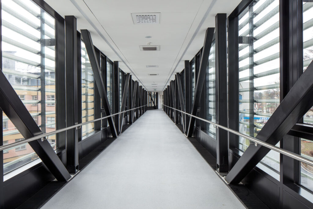 Komunikační mosty jsou celoprosklené, mají tvar tubusu s prostorovou příhradovou konstrukcí. Tvoří ji dva podélné vazníky, příčně propojené stropnicemi a doplněné ztužidly v úrovni podlahy i střechy. Na stropnicích je v úrovni podlahy na trapézovém plechu uložena železobetonová deska, v úrovni střechy nosný trapézový plech. Konstrukci podepírají dvě rámové konstrukce. Rámy tvoří dva sloupy, propojené příčlemi. S koridorem jsou spojené ve všech jeho vodorovných úrovních. Založeny byly na železobetonových základových patkách propojených základovým prahem.