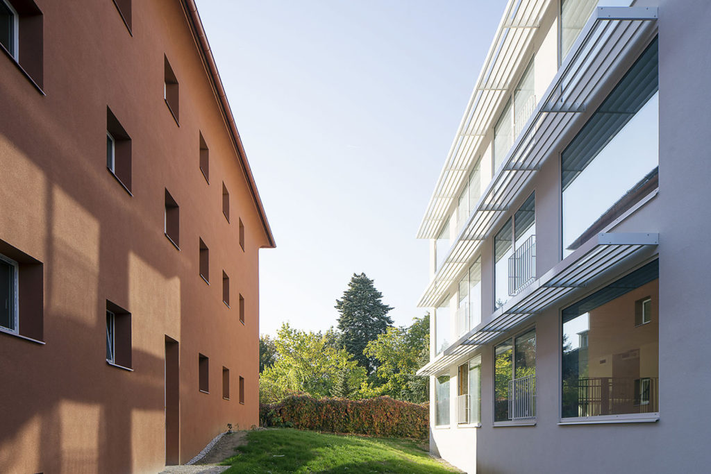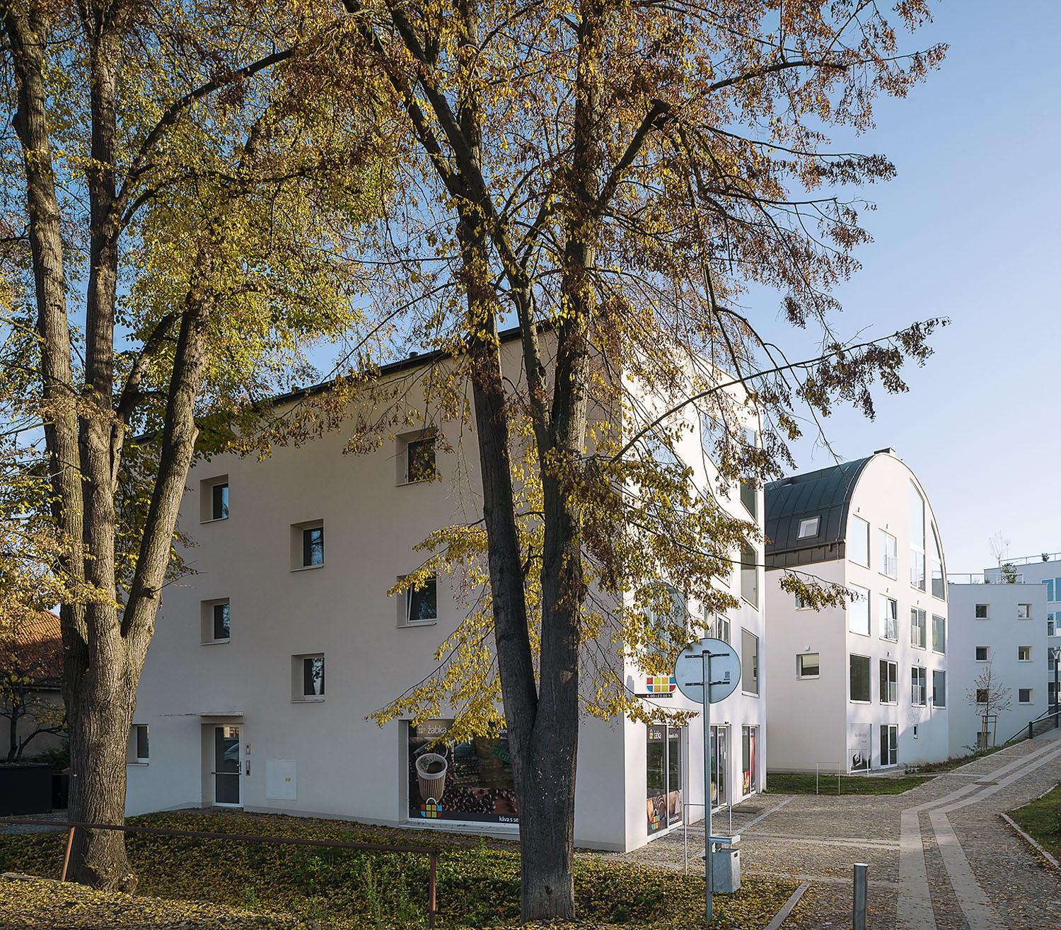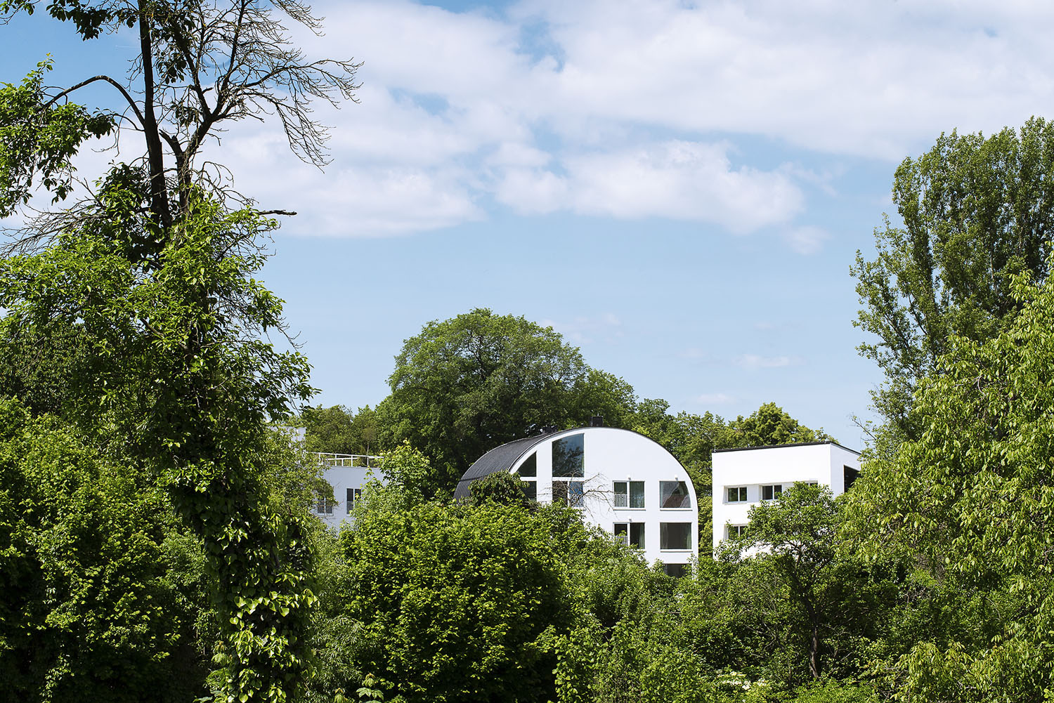 Jinak vypadá Rudolf trochu jako suchar, někde zapomněl čepici či klobouk – na střeše má místo toho krásné zahrady a terasy (pro byty posledního patra), uprostřed kouká jen malá nástavba nad schodištěm. Ani tady se v přízemí nebydlí. Cesta rovně vede jen k Sylvii, přitom míjí jednak vodní koryto, jednak stupňovité náměstí, které jako by bylo určeno k tomu, aby si tu při korzování v teplých dnech člověk sedl a jen koukal, co se děje. Sylvie má veliká okna převeliká, ukazuje, že v ní se nejen bydlí, ale taky se tu dá společně pracovat.