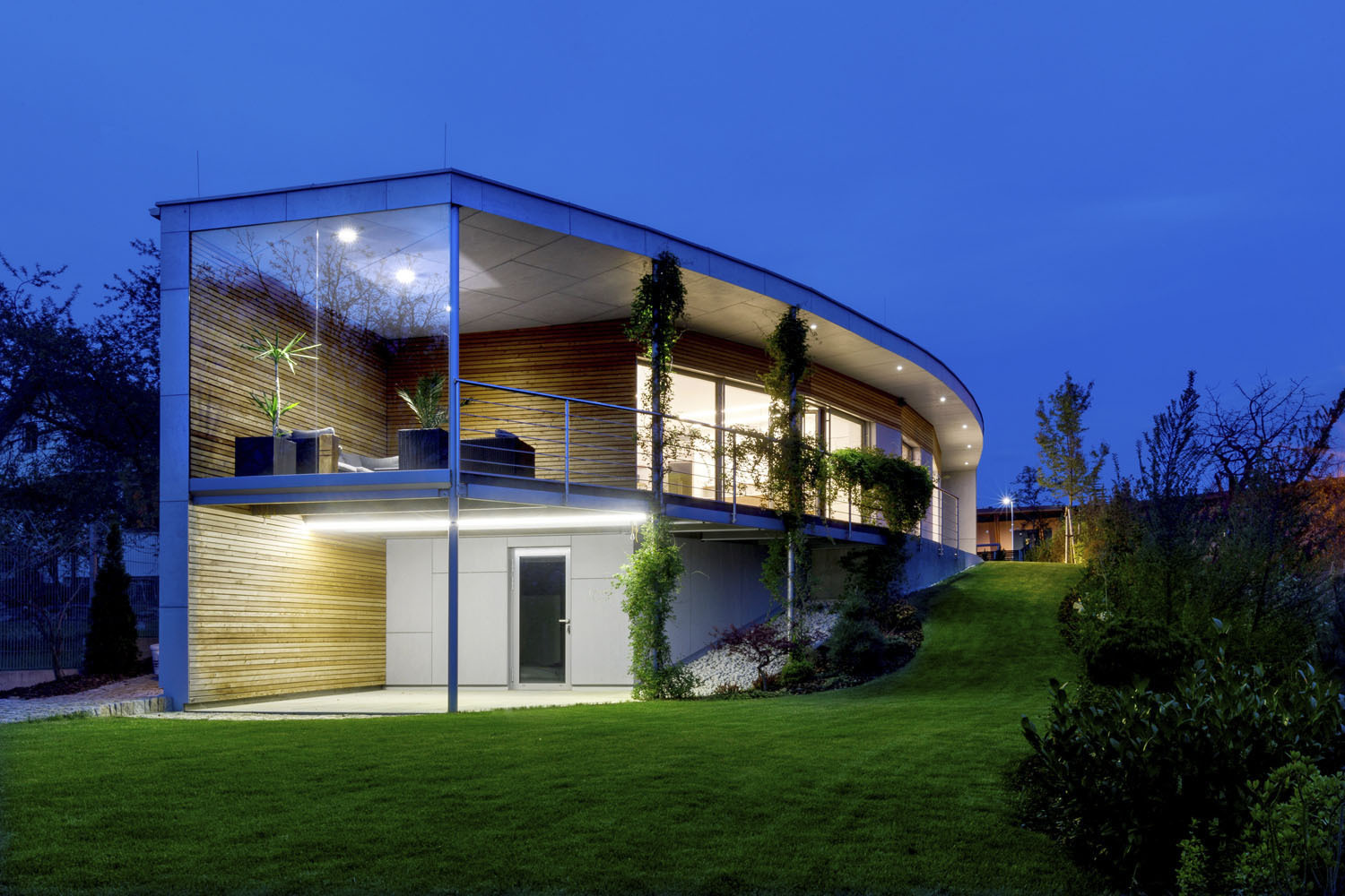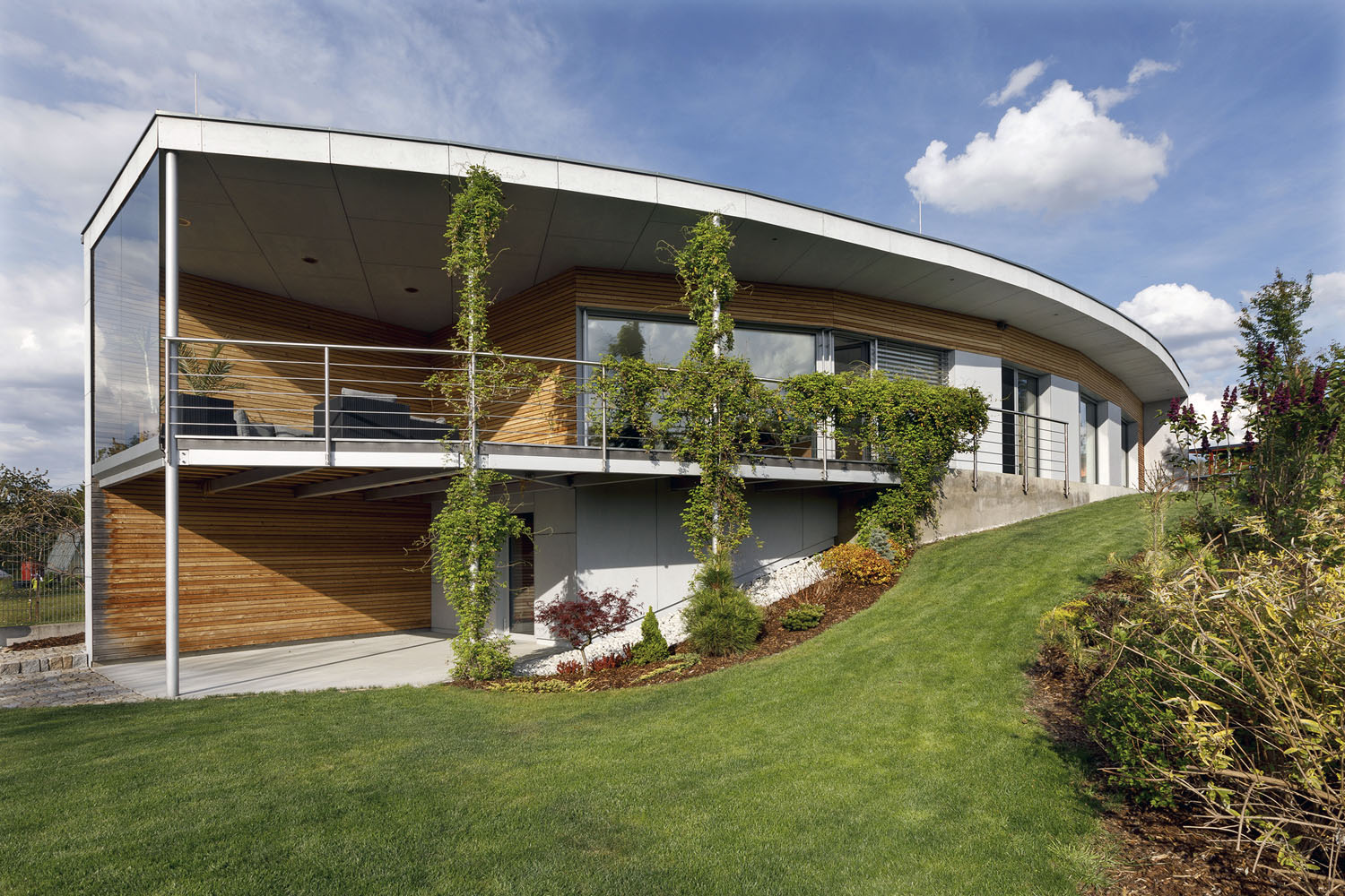 „Celá jižní stěna domu je oblouková, největší dynamiky zaoblení dosahuje oblouk v obývacím pokoji. Důvodem byla snaha oddálit obytné prostory od hranice pozemku a zajistit soukromí a ty nejlepší výhledy do okolí. Tradiční kvádr by byl agresivní, místnosti by byly vtlačeny příliš blízko k sousednímu pozemku a chyběl by ten intimní odstup vyplněný zahradou. Tvar domu je díky oblouku jemný a přirozený,“ vysvětluje ideu architekt Ing. Josef Vostracký.