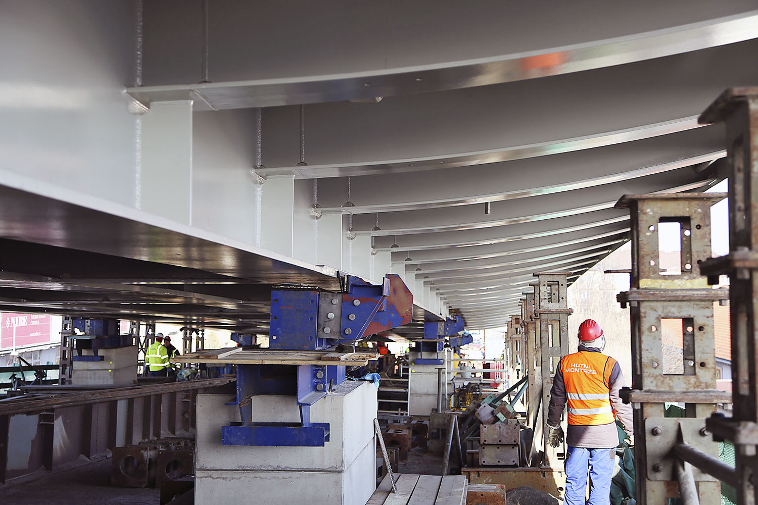 Poté byly svařeny stojiny mezilehlých příčníků. Před zahájením prací na příčných stycích bylo provedeno další kontrolní měření a případná rektifikace. Po dokončení svařování jednotlivých styků bylo provedeno finální geodetické zaměření konstrukce, byly provedeny nedestruktivní kontroly svarů a následně jejich otryskání a aplikace protikorozního nátěru.