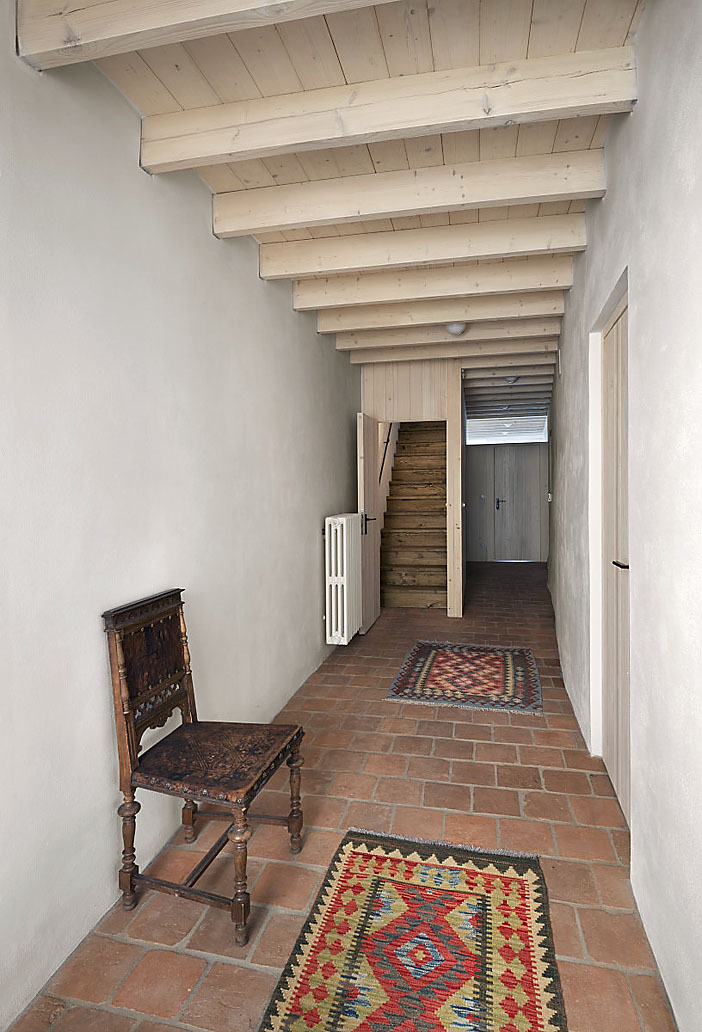 „Na její zadláždění jsme využili staré půdovky. Pro kuchyň, komoru a koupelny byla vyrobena dlažba s historickým vzorem, ostatní podlahy jsou dubové. Dlažba na dvorku je z odřezků z cihel, v jeho zadní části je nová kůlna s dílnou. Stěnu kůlny jsme se severním průčelím domu sjednotili fasádou z modřínových latí. Všechny nové dřevěné prvky v interiéru jako stropy, příčky a vnitřní dveře jsou z běleného smrku. Část nábytku byla vyrobena na míru a kombinuje bělený smrk, dubové prkno a lakovanou MDF,“ dodává Markéta Cajthamlová.