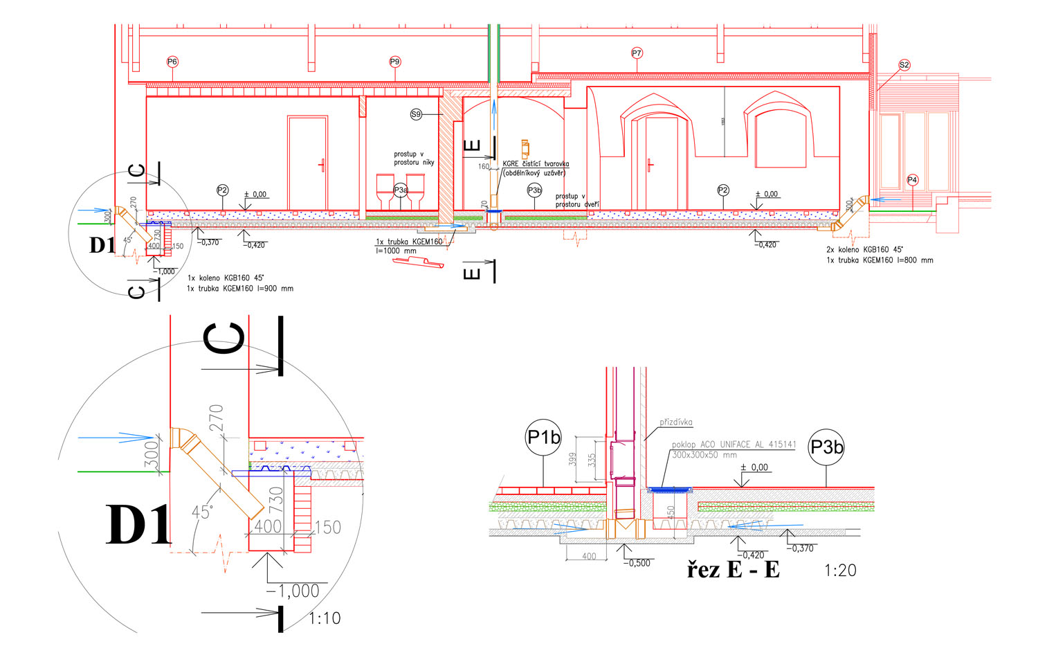 Podlahy se odstranily do hloubky základů, v některých místech byly základy dodatečně podezděny nebo vyspraveny. Potrubí pro přívod a odvod vzduchu je napojeno na potrubí, které ústí pod nopovou fólií. Na svislé větrací potrubí byla v nadstřešní části osazena komínová větrací hlavice.