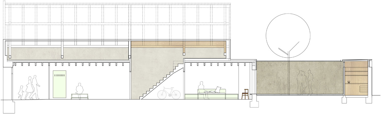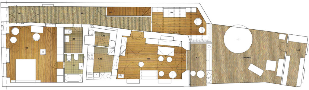Dřevěné podlahy: rostlá zemina; beton tl. 50 mm; nopová fólie + beton tl. 100 mm; beton + KARI síť tl. 60 mm; pěnové sklo Refaglas; polštáře 80 mm; dřevěná prkna tl. 18 mm