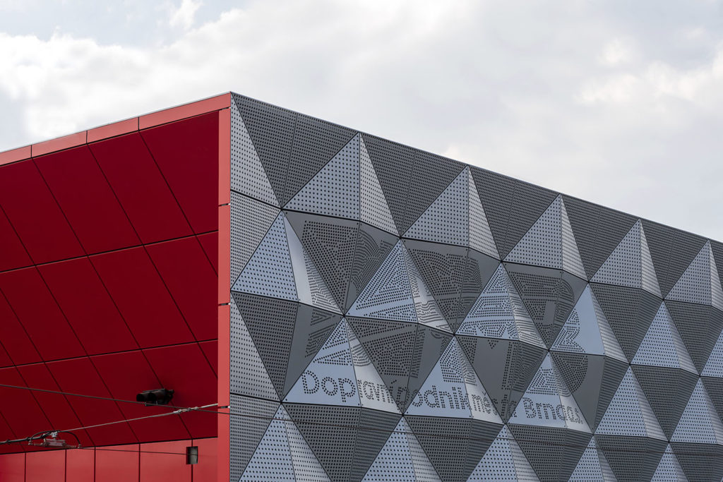 Nová hala Dopravního podniku města Brna je stejně dlouhá jako Špilberk, má však jen jedno okno vysoké přes pět a půl metru a dlouhé více než 23 metrů. Podstatným limitem návrhu její fasády do ulice bylo hlukové zatížení veřejného prostoru. Autoři projektu z ateliéru dkarchitekti se proto rozhodli pro prolamovaný perforovaný hliníkový plášť, za nímž se skrývá zvukově pohltivá vrstva materiálu.