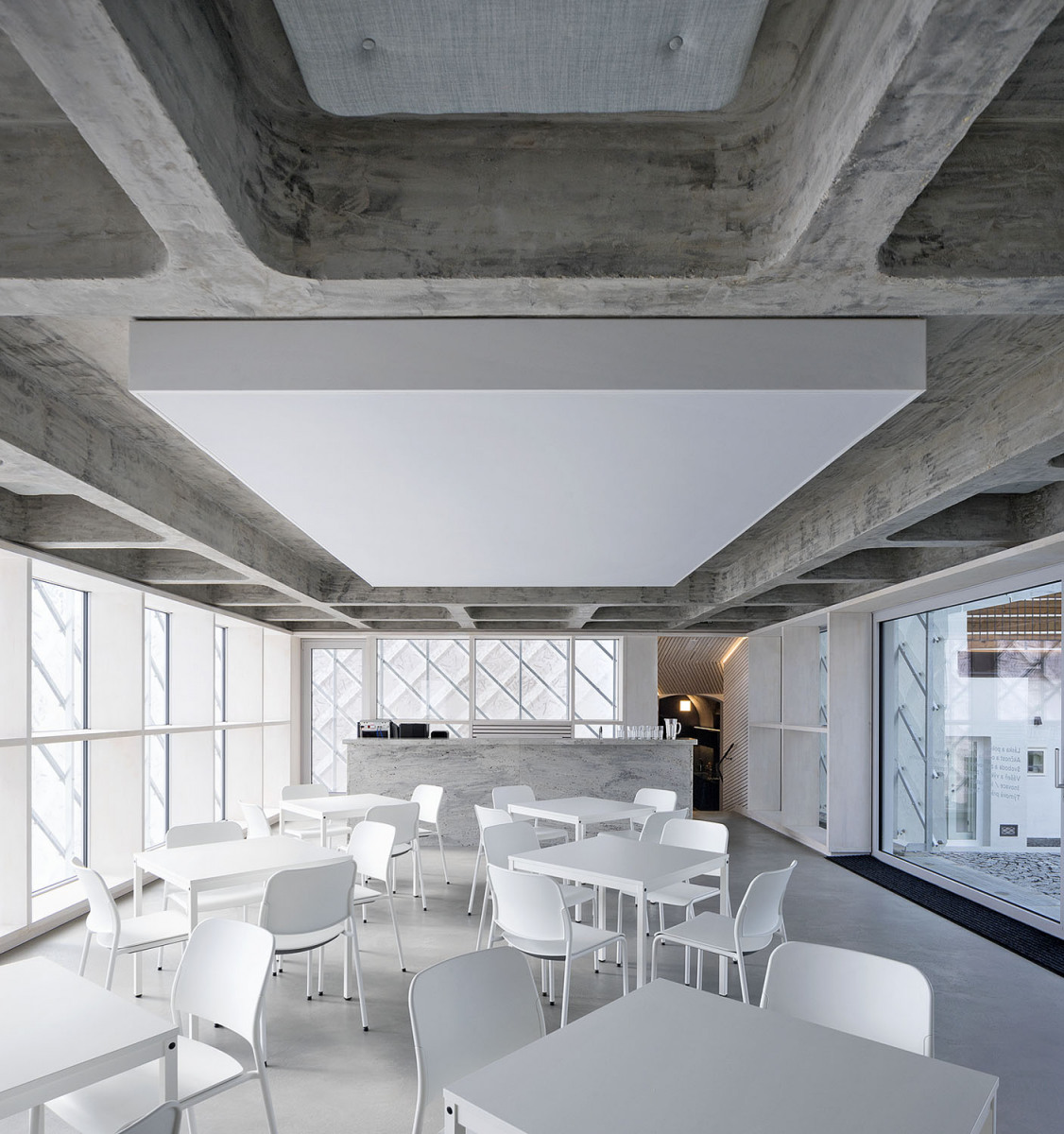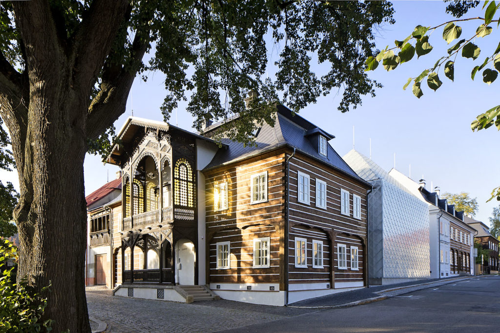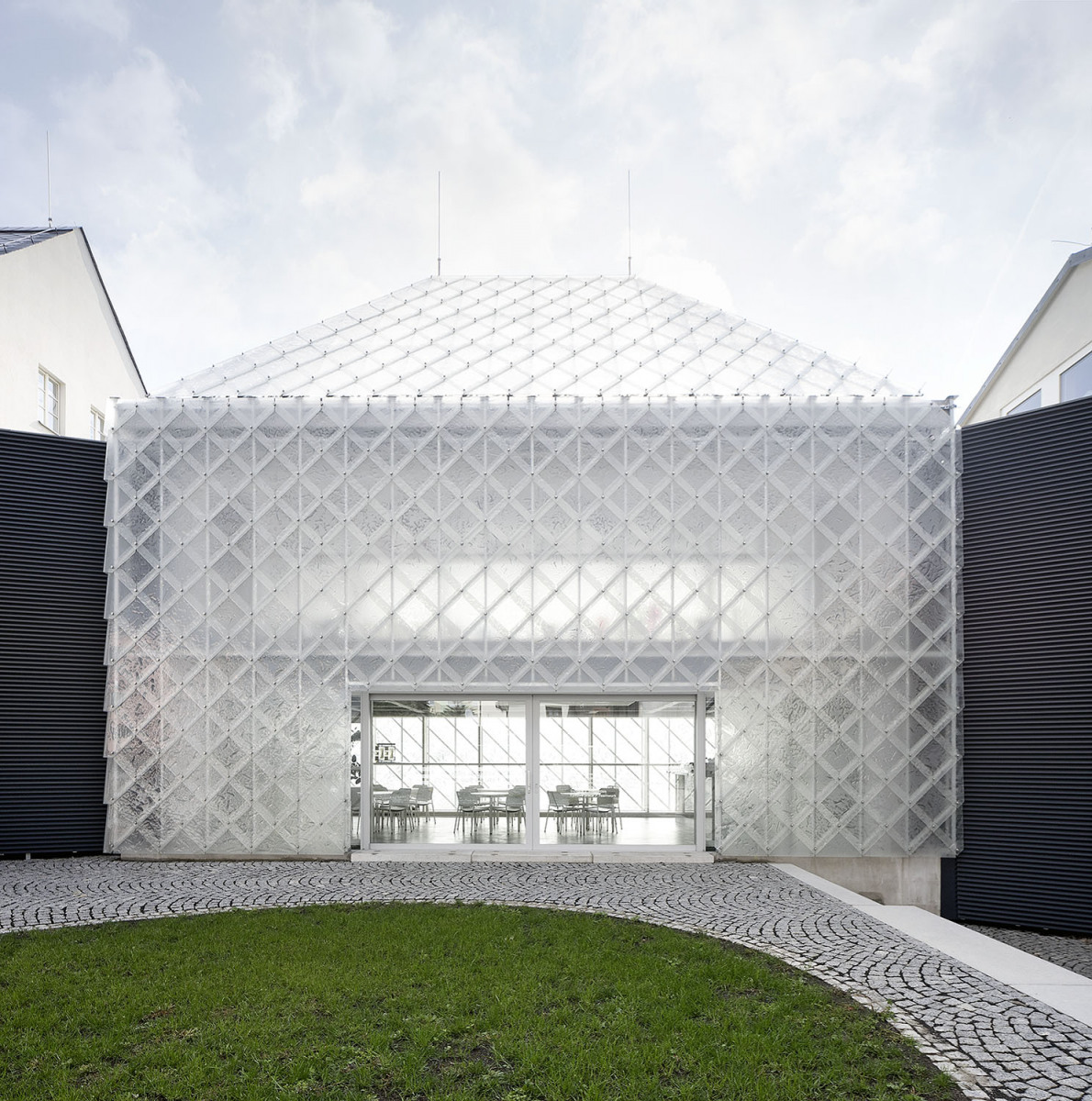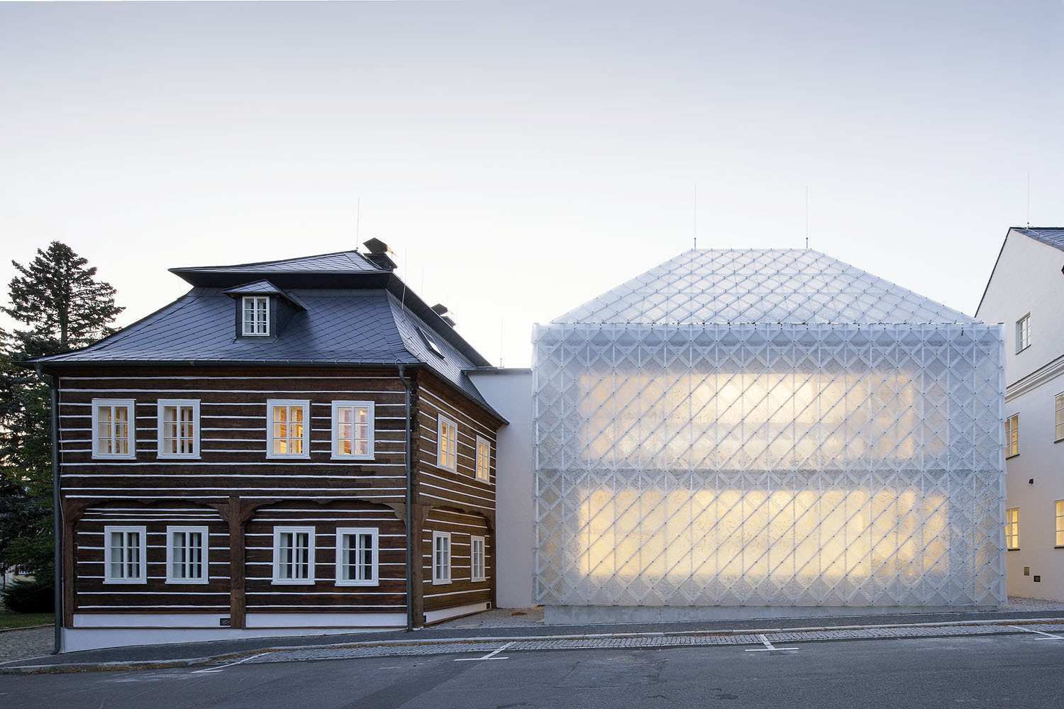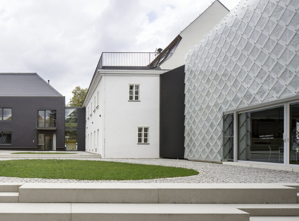 Historické stavby původně propojoval zděný krček, který nahradil skleněný dům – ten se stal hlavním prostorem sídla firmy. Zcela atypické je řešení jeho obvodového a střešního pláště. Tvůrci projektu se nechali inspirovat břidlicovými šablonami, historicky využívanými v této lokalitě k pokrytí obvodových konstrukcí budov. Navrhli a vytvořili skleněné šabautor: lony s rozměry a texturou připomínajícími břidlicové desky, kterými celý objekt opláštili. Atypické skleněné šablony se osadily na ocelovou konstrukci.