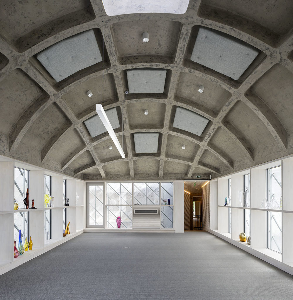 Interiér budovy je obklopen policemi, využívanými pro uložení skleněných prvků a vzorků, které využívají denního světla prostupujícího fasádou; večer jsou podsvíceny a září do vnějšího prostoru.
