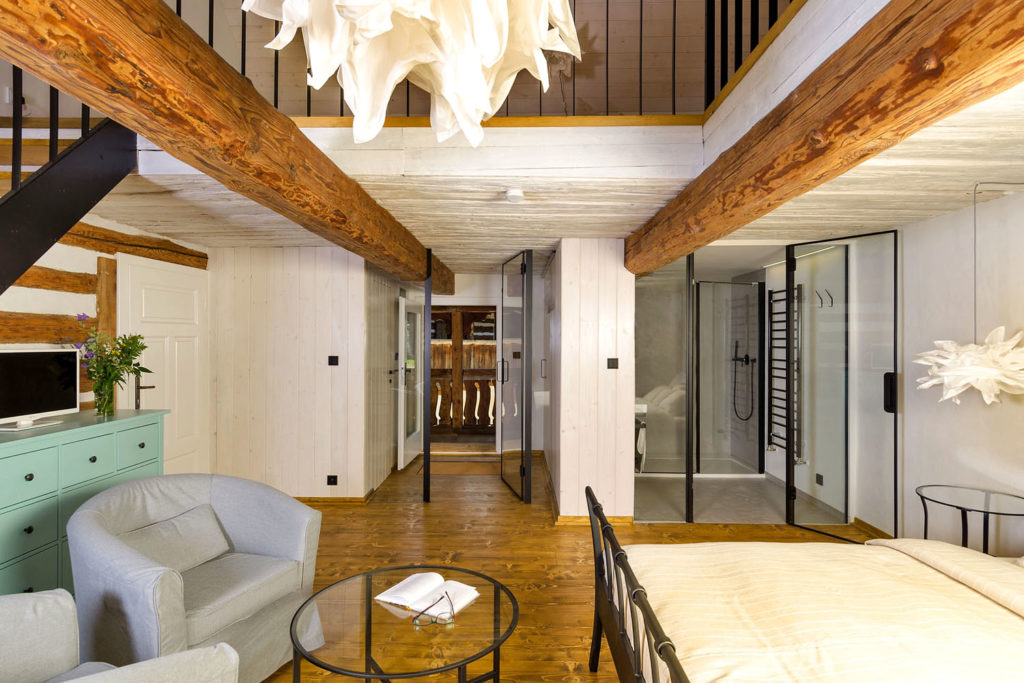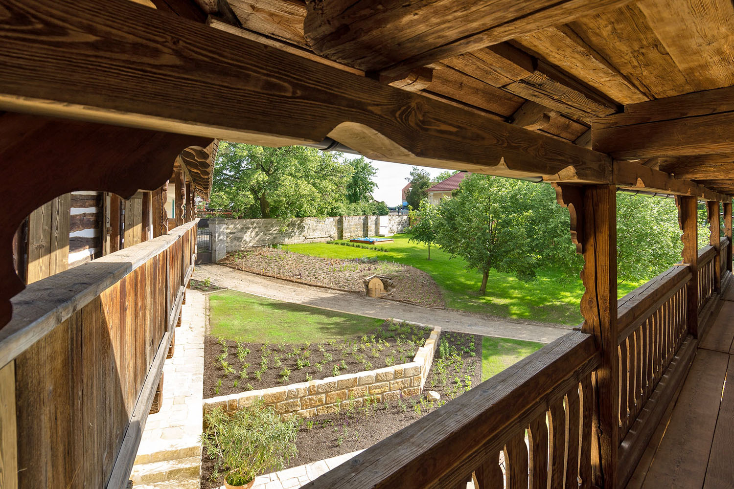 Výplně otvorů v roubených konstrukcích jsou pak v odstínu signální bílé. Pokoje přístupné z pavlače mají „dvojité dveře“ – na vnitřním líci se osadily nové tepelně izolační dřevěné prosklené dveře (bílé s čirým zasklením), z pavlače vnější svlakové prkenné dveře v odstínu roubení.