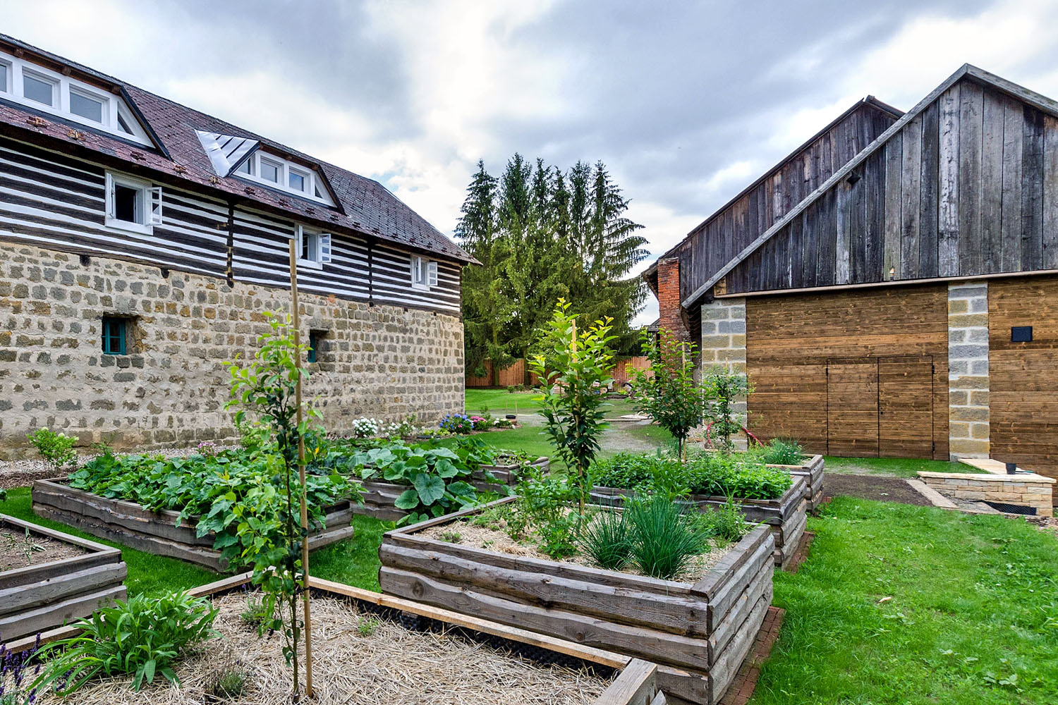 Dostavba hospodářských budov byla provedena v původním architektonickém duchu. Původně se využívaly jako stáje, v patře byly oddělené prostory pro sušení různých plodin včetně divokého chmele. Přízemní část má převážně kamenné zdivo z pískovcových bloků, dvorní průčelí je omítané, směrem do zahrady bylo ponecháno v pohledové formě. Konstrukce patra je roubená dřevěná.