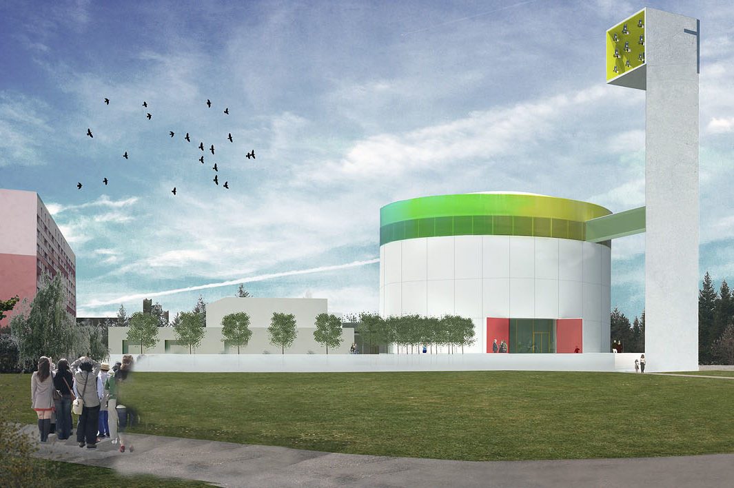 „Urbanistické řešení vycházelo z jednoduchých linií a logiky sídliště. Obdélné plato jsme od okolí oddělili tak, aby bylo vnímáno jako sakrální okrsek. Budou na něm tři základní hmoty – kostel, věž a duchovní centrum. Stávající centrum a věž jsou pravoúhlé, tedy v souladu s okolním sídlištěm, kostel bude kruhový. Kruh je odvěkým symbolem nebe a věčnosti, čtverec oproti tomu odkazuje na zemi a pomíjivost. Nebe se bude odrážet v barevném pásovém okně, které kostel obepíná pod střechou.“ uvádí architekt Štěpán.