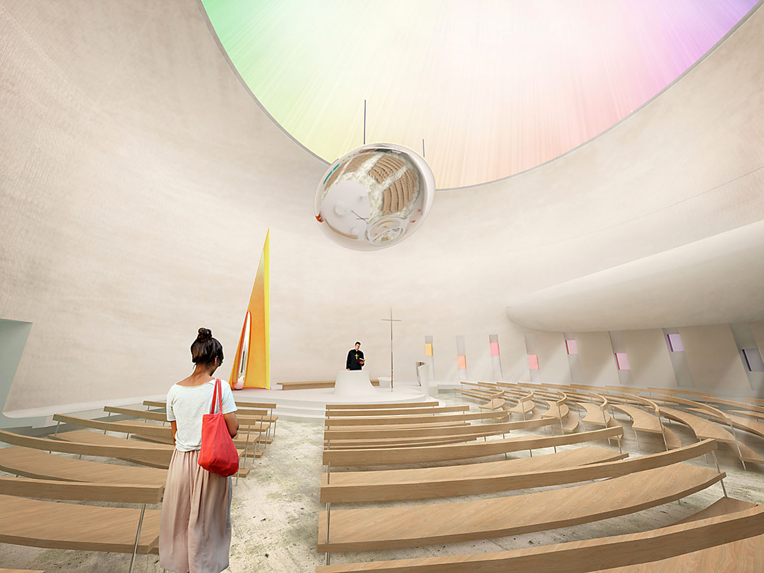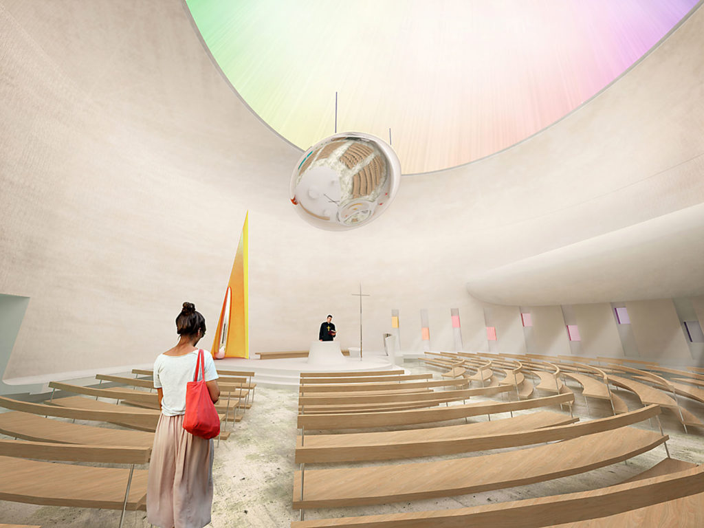„Dá se tak říci, že se kruh vznáší nad Lesnou a v přenesené duchovní rovině se tu bude vznášet nebe. Tvar kruhu byl zvolen i z dalších důvodů – kruh je výrazem plnosti, tečkou v prostoru sídliště, jeho duchovním úběžníkem, místem spočinutí. Navíc je blízký i současné liturgii,“ dodává.