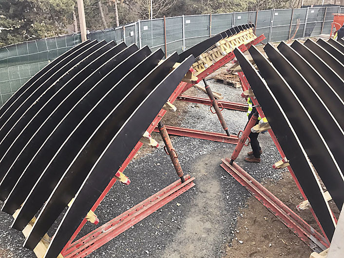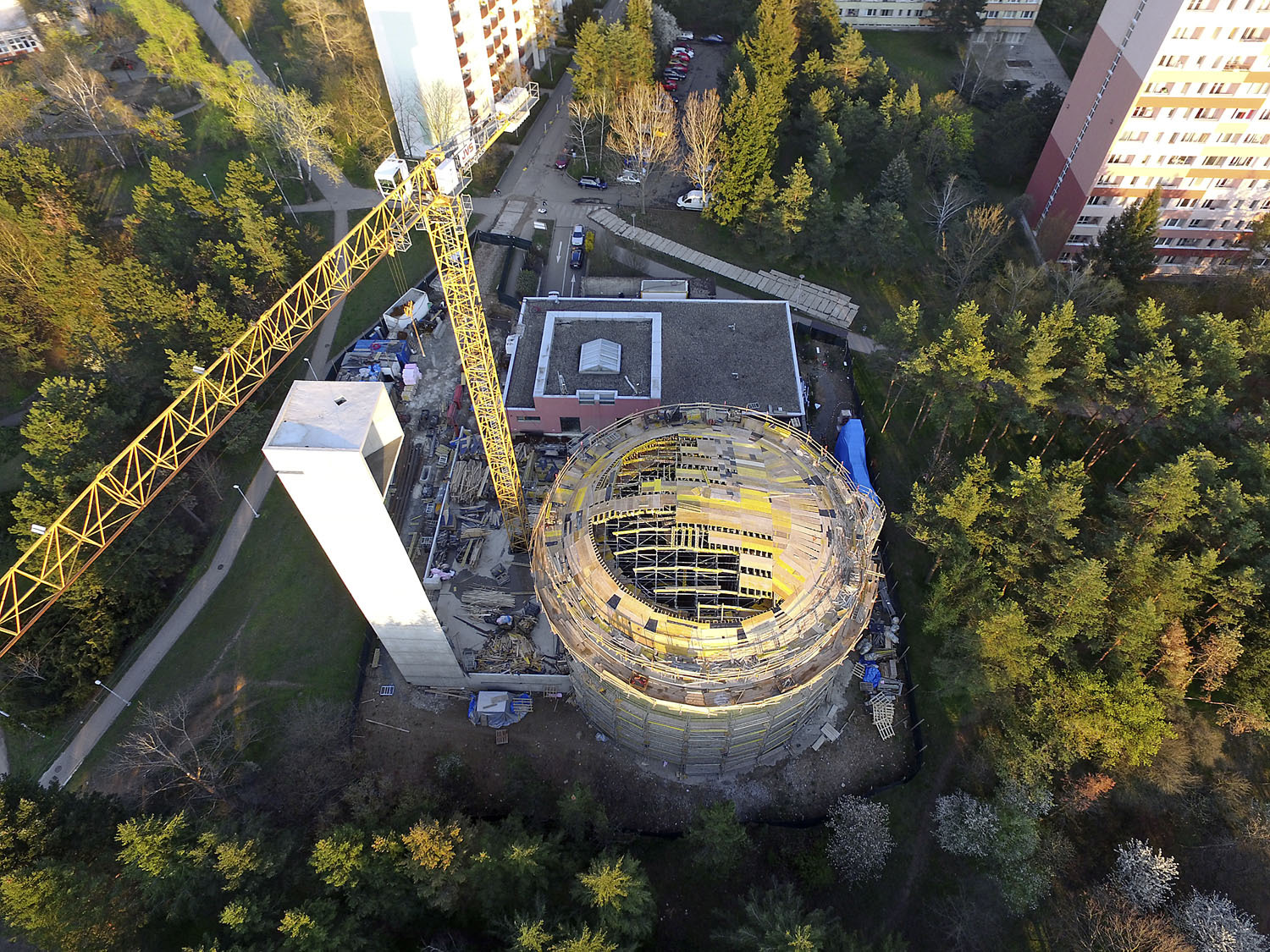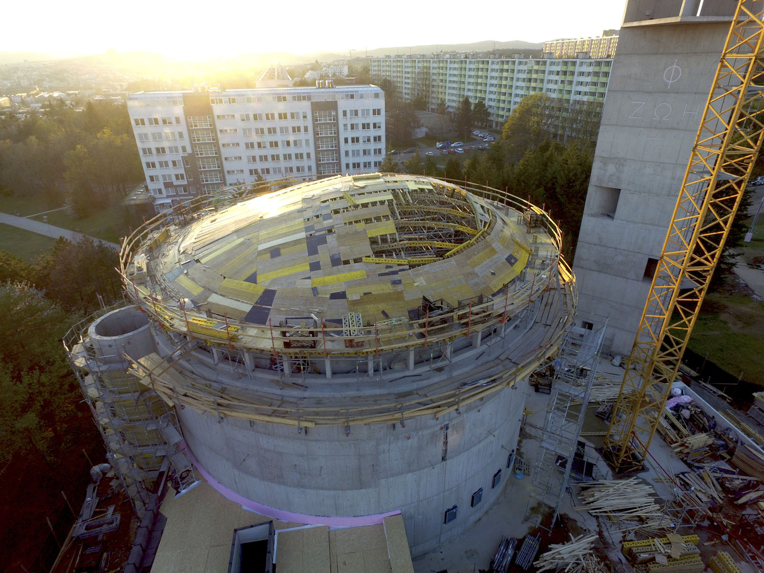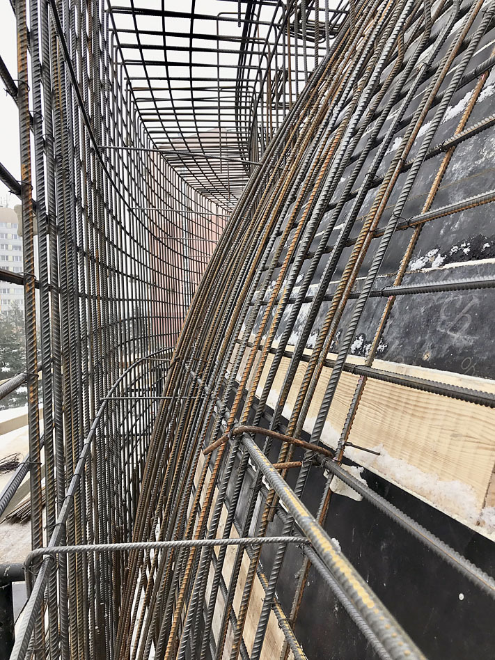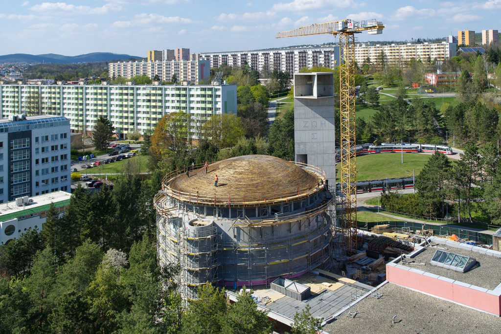 „Kopule se lila v květnu letošního roku do prkenného bednění z krajin z důvodu plasticity povrchu. V tuto chvíli ještě není odbedněná. Vodorovné síly zachytávají předepjatá lana v úrovni paty římsy i kopule. Výsledný vnitřní povrch lodi bude pemrlován, vnější povrch jsme zvolili jako břízolit na zateplení. Z původního záměru zavěšených betonových fasádních panelů bylo z finančních důvodů upuštěno. Věž a plato zůstanou v pohledovém betonu do překližky litého,“ uzavírá architket Štěpán.