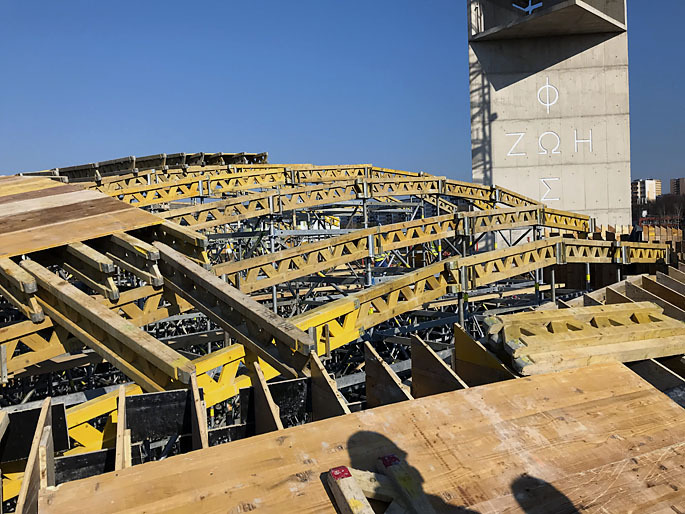 V létě loňského roku byly dokončeny podzemní prostory, brzy poté se začalo s realizací nosných betonových konstrukcí. Nejprve 31 m vysoké věže troujúhelného půdorysu s kubickou hlavou. V odvěsné stěně věže byl plasticky vylit řecký nápis Fós Zoé (světlo – život), v rohu hlavice je štěrbina ve tvaru velkého kříže. Ve věži jsou vybetonovány i hlavní podesty přejímající půdorys kruhového schodiště, které se sem jako kovové montované vloží.