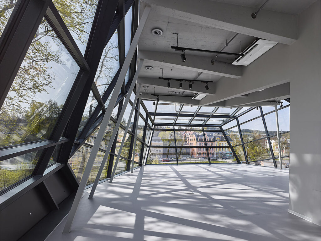 Nosnou konstrukci prosklené fasády tvoří ocelové rámy z uzavřených ocelových profi lů. Vzhledem ke komplikovanému tvarovému řešení bylo provedeno 3D geodetické skenování objektu, na jehož základě byl upřesněn tvar ocelové konstrukce a její kotvení.