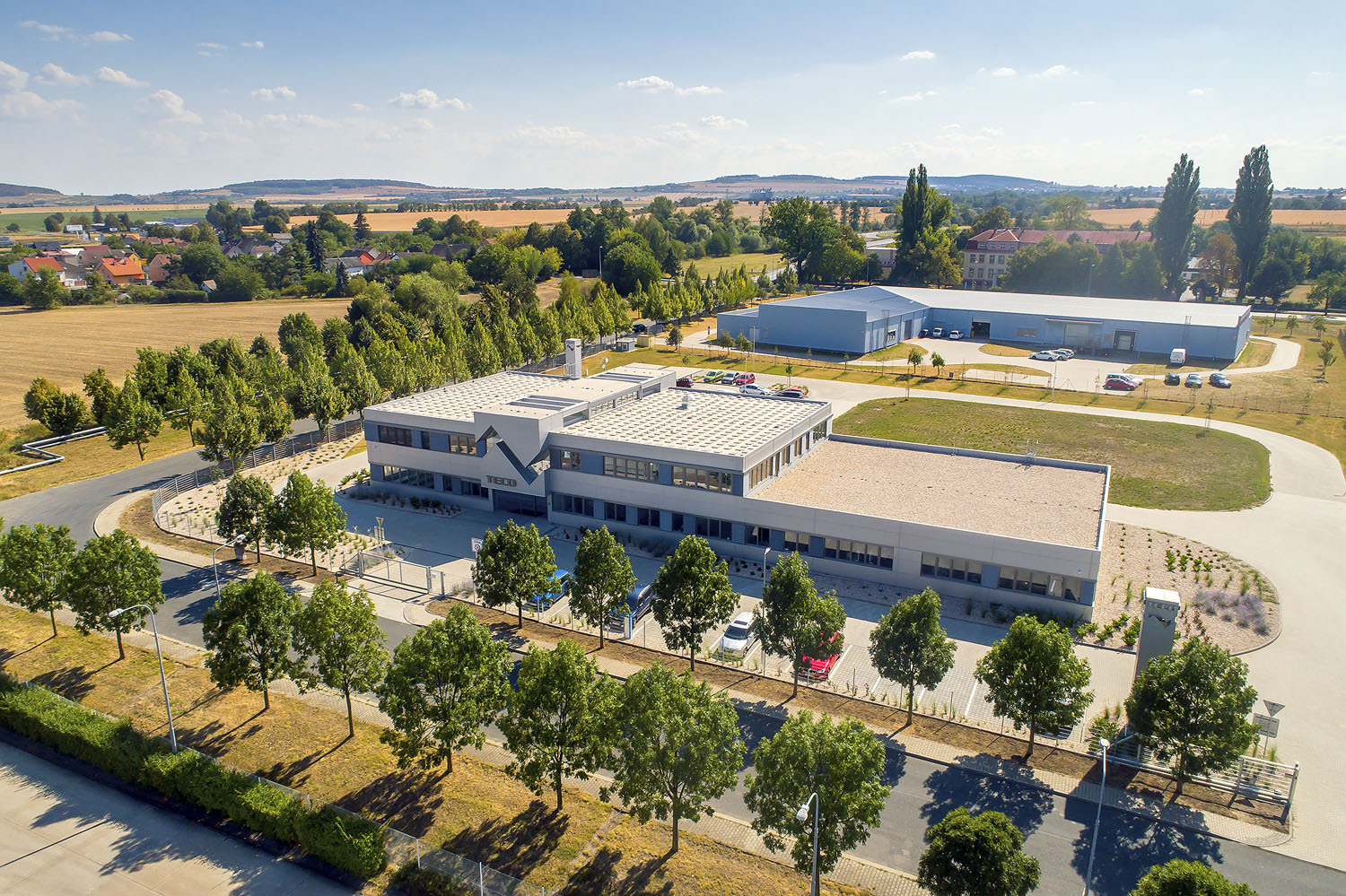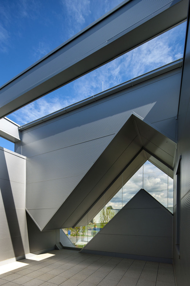 Kompaktní, vizuálně čistá stavba v průmyslové zóně na východním okraji Kolína, je pevně zakotvená do Polabí. A to doslova – stojí na 56 železobetonových pilotách a je napojena na dvanáct 125 m hlubokých vrtů, kterými cirkuluje voda. Je tak spjata se zemí nejen staticky, ale i energeticky.
