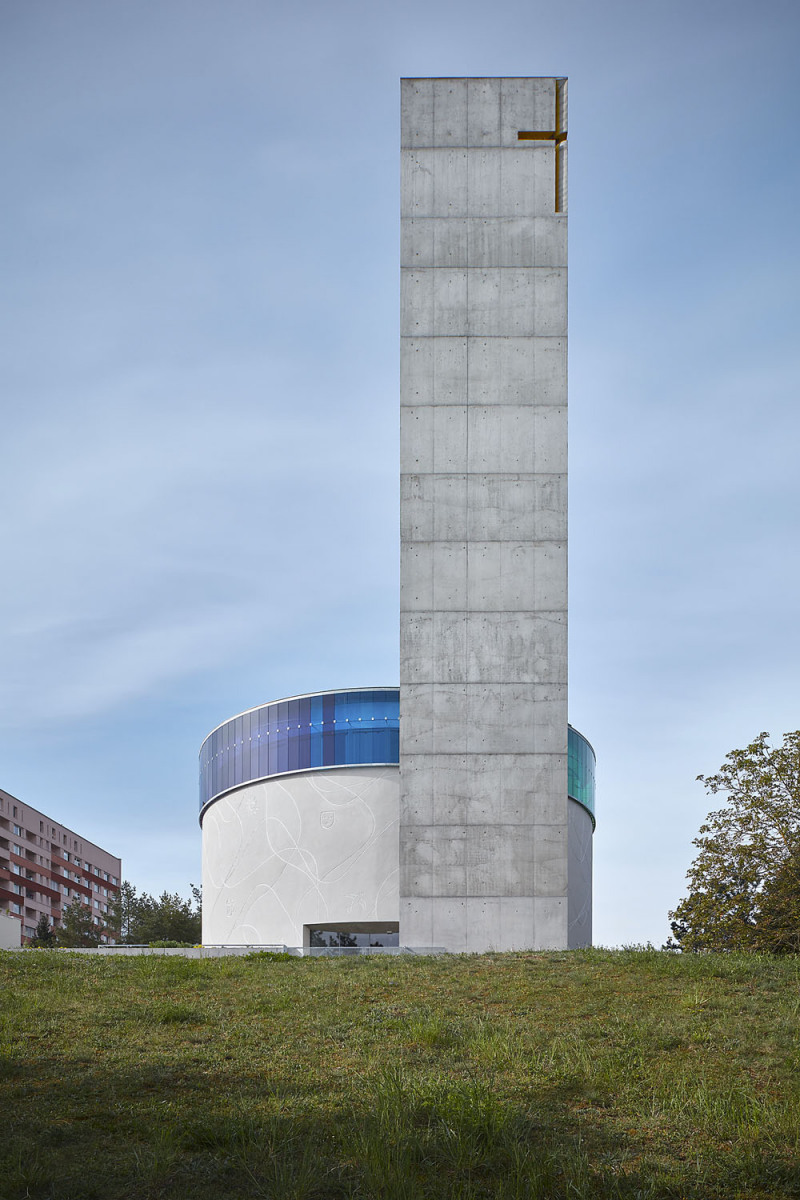 „Od expresivní kompozice jsem se posunul k tělesu plynoucímu časem. Původní návrh byl břichem velryby, nový vytváří vnitřní vesmír,“ říká architekt Štěpán a dodává: „Kostel stojí nedaleko takzvané Čertovy rokle, což je nádherně absurdní paradox. Zásadní roli v návrhu hrála symbolika – odráží se v podobě kruhového půdorysu jako symbolu nebe, v duhovém zbarvení skla odkazujícím k symbolice smlouvy mezi Bohem a lidmi i v kresbách na fasádě. Tvar kruhu jsem pro kostel zvolil i z dalších důvodů – je tvarem plnosti, tečkou v prostoru sídliště, jeho duchovním úběžníkem. Kruh je zároveň blízký současné liturgii, která je obrazem společenství apoštolů s Ježíšem kolem stolu při Poslední večeři. Nejpodstatnějším symbolem tu pro mě ale bylo světlo.“
