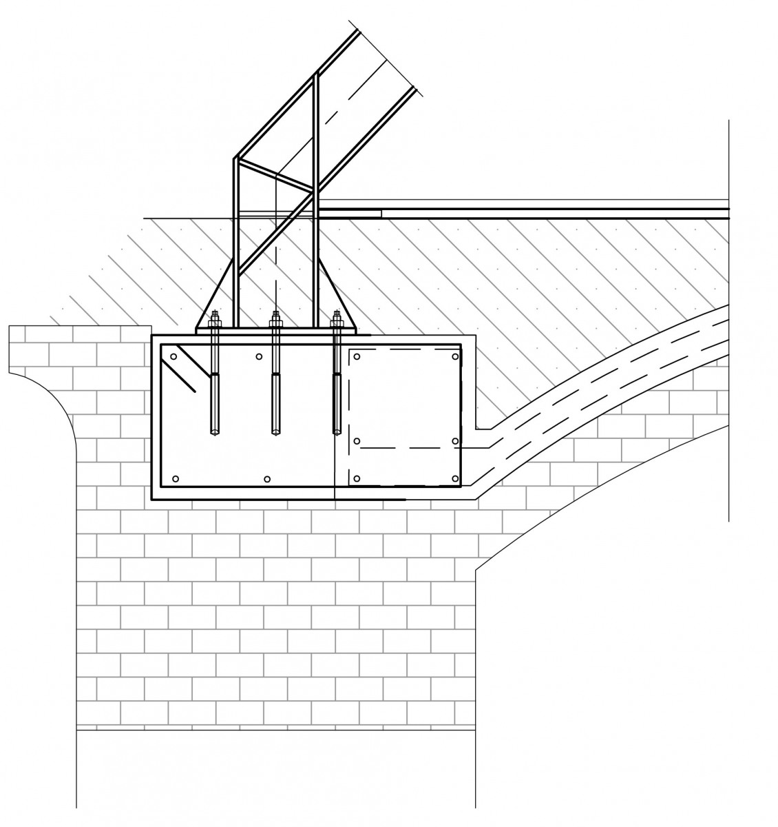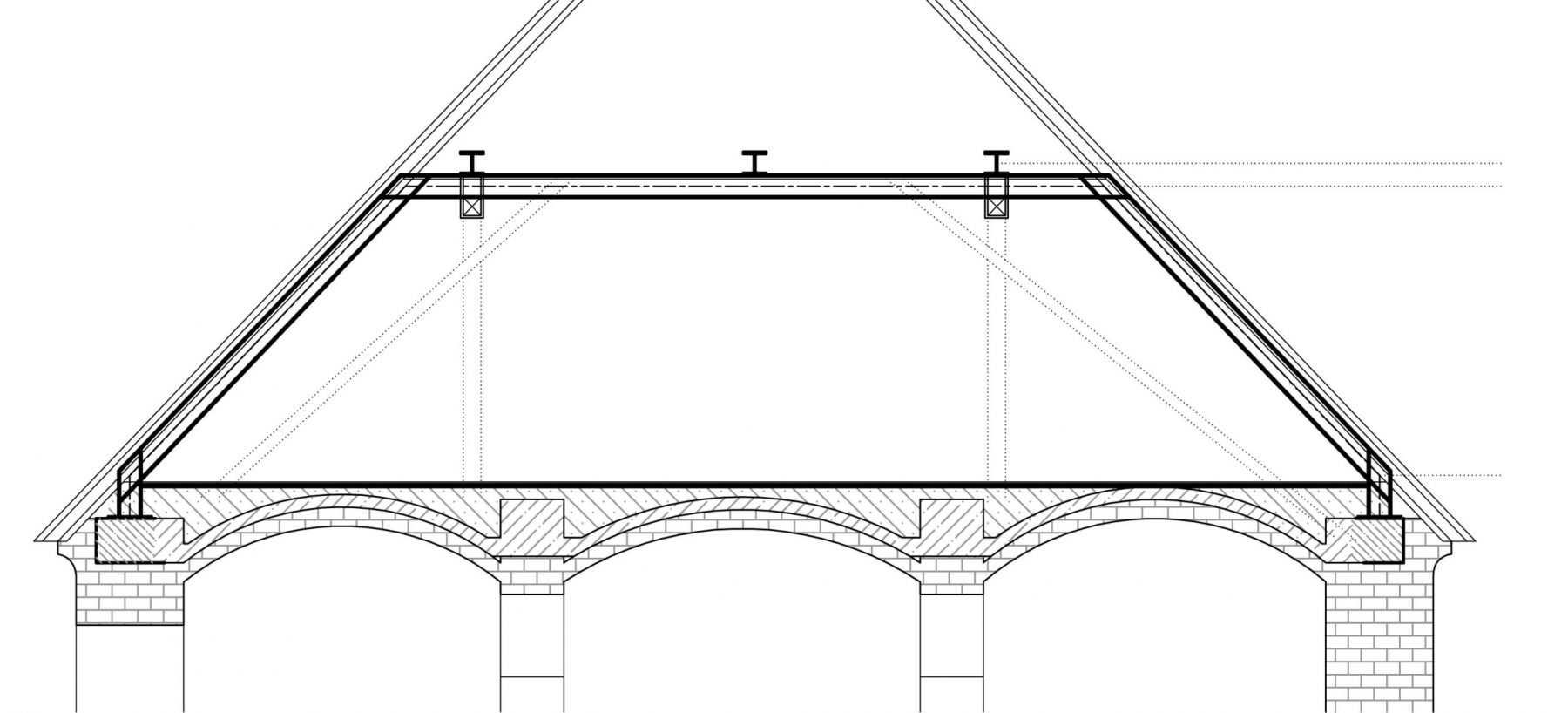 V krajní valbě chtěl investor odstranit sloupy podpírající nárožní krokve. Byl proto navržen ocelový rám, který přenáší veškeré zatížení od krovu do obvodových stěn. Rám je propojen s novou železobetonovou skořepinou, která vznikla nad cihelnými klenbami.
